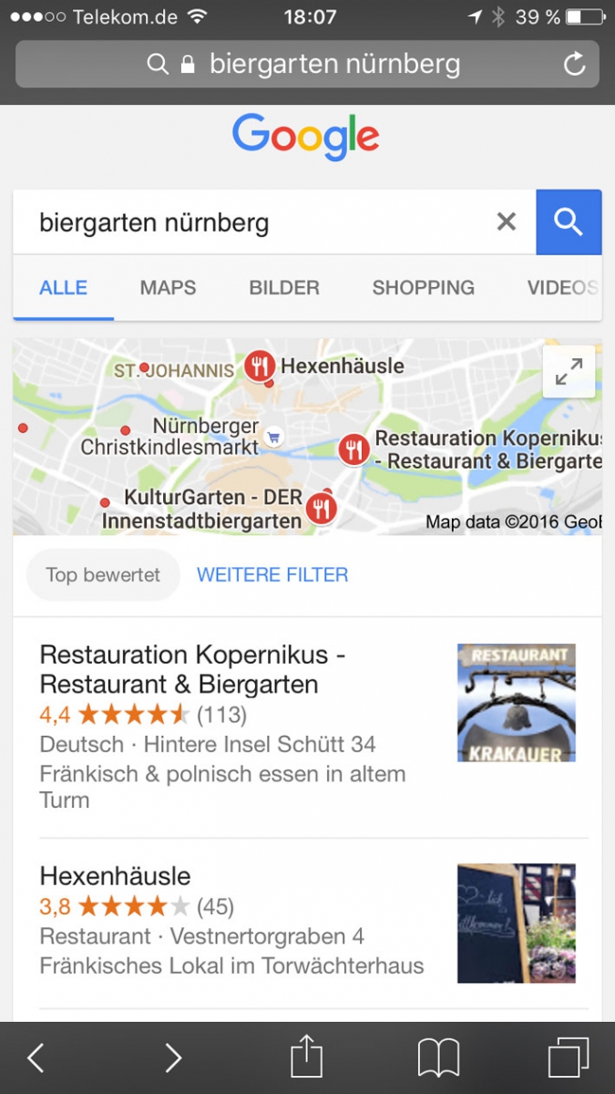 Durch ein optimiertes My Business Profils und eine gute lokale Suchmaschinenoptimierung wird die Webseite vom Restauration Kopernikus bei der Suche nach "Biergarten Nürnberg" an der ersten Stelle in der Karte angezeigt.